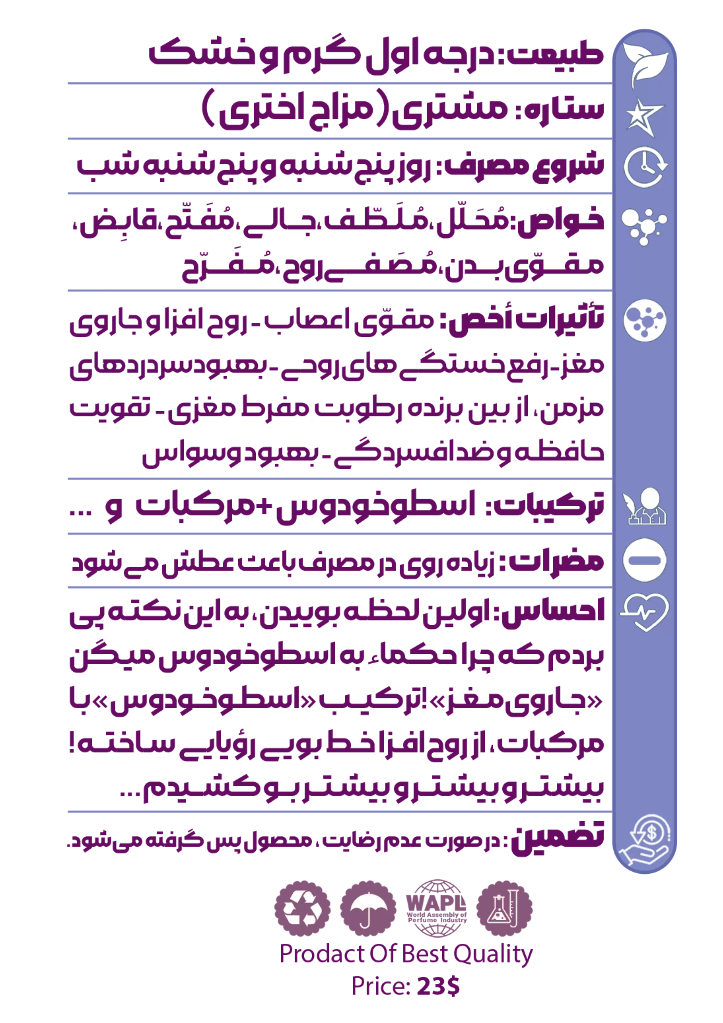 ترکیبات: باریجه، شاهدانه، سُنبله، زعفران، زنبق و...