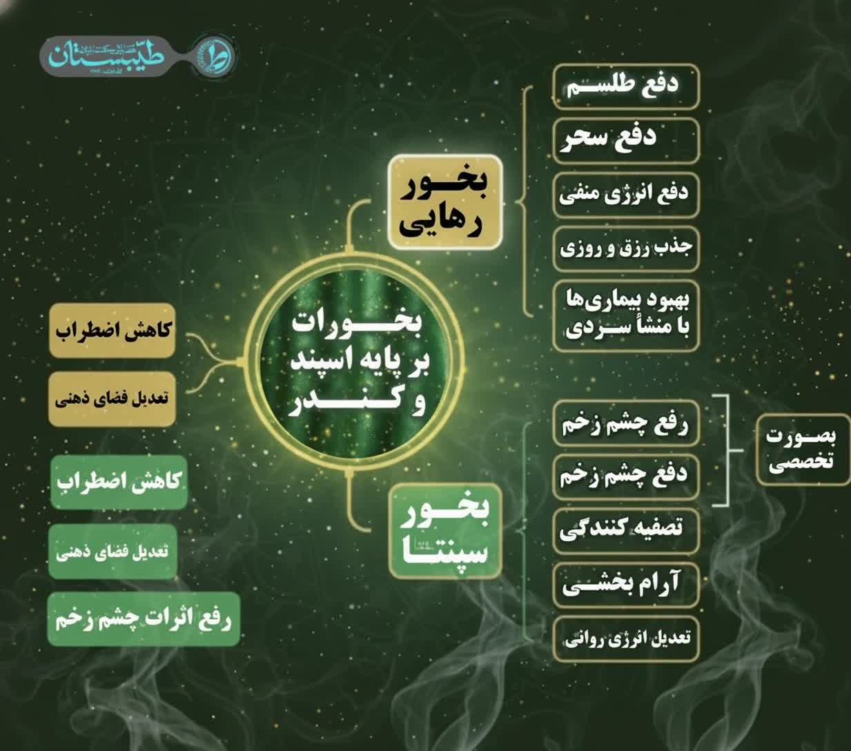 مطالعه تطبیقی این عناصر در منابع طب و حدیث، نشان میدهد که بخورهایی بر پایهی اسپند و کندر علاوه بر اثرات رایحهدرمانی، میتوانند نقش مؤثری در کاهش اضطراب، تعدیل فضای ذهنی، و رفع اثرات ناشی از چشم زخم داشته باشند.